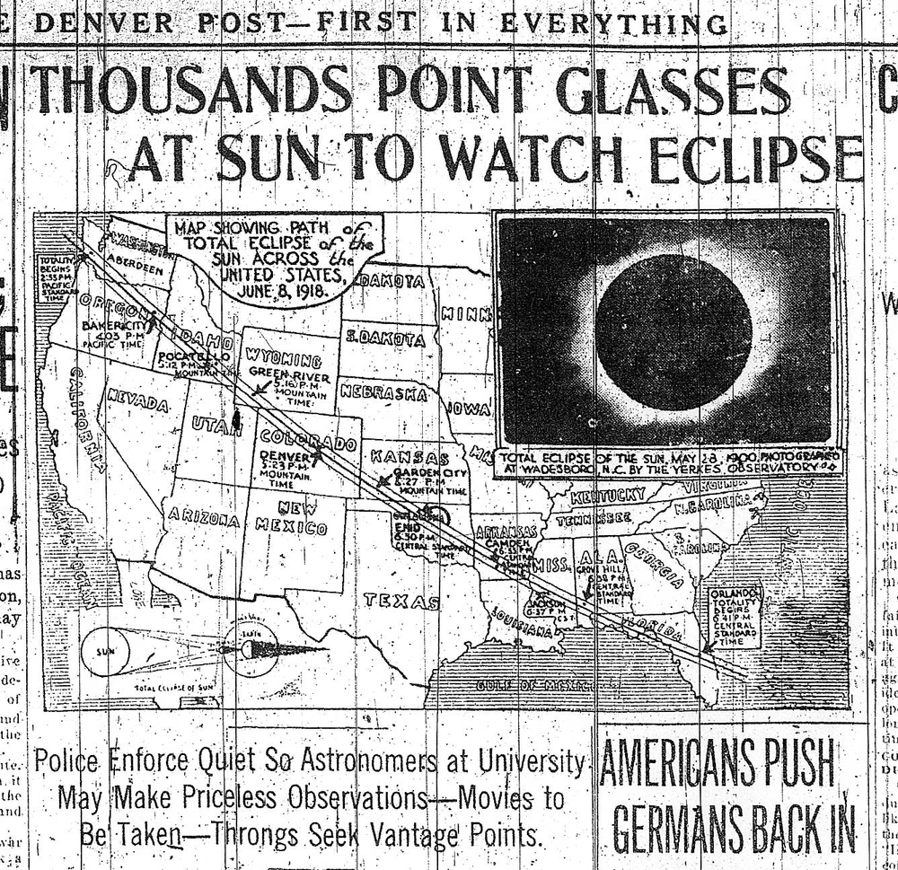 Today, August 21, 2017, the US will experience a total solar eclipse that will go across the continental United States, from the Pacific to the Atlantic. The last time this occurred was on June 8, 1918, proceeding from Washington State across the US to Florida. The press gave heavy coverage to the eclipse and rightly warned of the risk of blindness by looking at the eclipse with the naked eye.