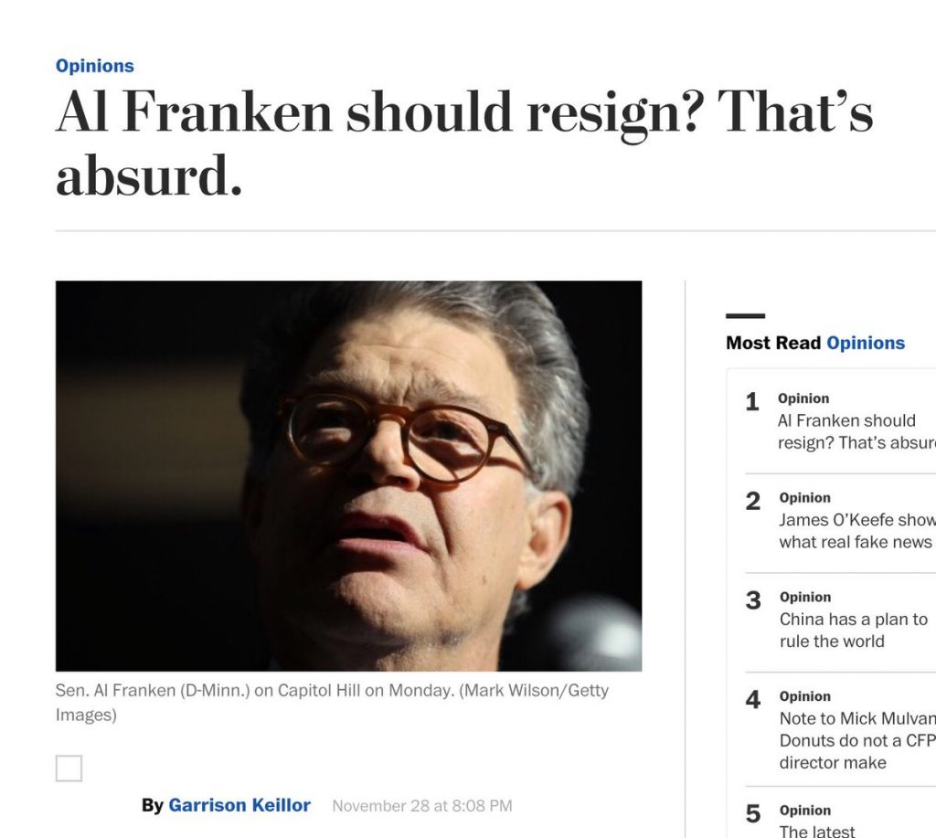 Garrison Keillor in an Op Ed in the Washington Post, November 29, 2017, entitled Al Franken Should Resign? That’s Absurd.