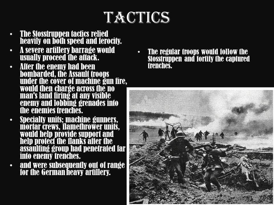 Thus the German high command, rolling the iron dice of war. was ready to launch a great offensive against the British, hoping to drive them from the Continent, defeat France and usher in an era of a German dominated Europe. The German forces in the West were greatly reinforced by German forces from the no longer existing Eastern Front. Special units of the German Army, trained in stosstruppen tactics of fire and movement, and avoiding Allied strongpoints, would lead breakthroughs of the Allied trenches, and bring to an end the stasis of the Western Front.