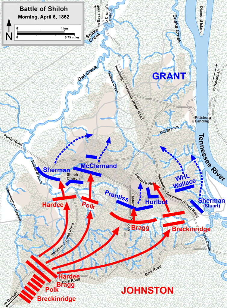 The Confederate troops performed superbly, considering that they were all green and they were poorly armed with an astounding multiplicity of weapons, launching one of the most ferocious assaults of the war, pursuing Union troops, about half of whom were green, as many of them stampeded to the rear from the initial attack. Sherman was caught off guard, but he responded well, leading his troops in his division in a stubborn resistance and a fighting retreat. The hero of the first day for the Union was Brigadier General Benjamin Prentiss. Leading troops from his division and WHL Wallace’s division he held a salient that would be known thereafter as the Hornet’s Nest from 9:00 AM – 4:00 PM, until he and his heavily outnumbered troops surrendered, buying Grant just enough time to prepare a final defensive line before Pittsburg Landing which held as the sun set.