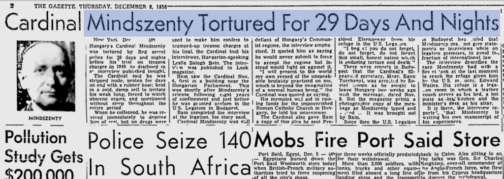 The heart and soul of the struggle in Hungary was one of the great men of the 20th Century: József Cardinal Mindszenty, primate of Hungary. Imprisoned by the pro-Nazi government in Hungary during World War II, he was imprisoned, tortured and condemned in a show trial by the puppet Communist regime after World War II. Freed by Hungarian patriots during the Hungarian revolt, he quickly joined the revolt. After it was crushed he took refuge in the American embassy in Budapest where he stayed for 15 years, a symbol of the unconquerable spirit of his beloved Hungary. Shamefully, in my view, the Vatican compromised with the Communist regime, annulling the excommunication imposed by Pius XII on all involved with the trial of Mindszenty, and calling him “a victim of history” rather than “a victim of Communism”. Mindszenty traveled to Vienna rather than Rome, upset at the suggestion of the Vatican that he should retire and live in Rome. He was stripped of his titles by Pope Paul VI in 1973, although the Pope did not fill the primacy until after the Cardinal died in 1975. The Church in Hungary has launched a strong effort to have the Cardinal proclaimed a saint, and I pray that it is soon crowned with deserved success.