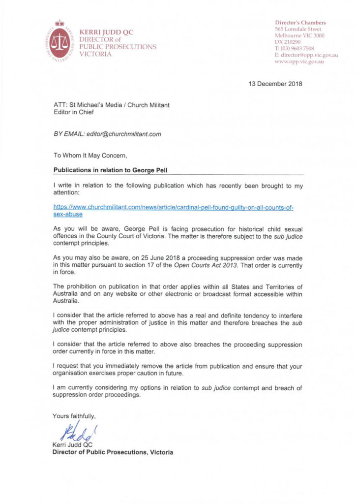 Thursday, Kerri Judd, a member of the Queen’s Council, sent a letter to Church Militant informing us we are in breach of a suppression order issued by Chief Judge Peter Kidd, which prohibits publication of any information related to Pell’s conviction in Australia. The reason for the gag order is ostensibly to prevent influencing the jury in a forthcoming trial on a separate set of charges.