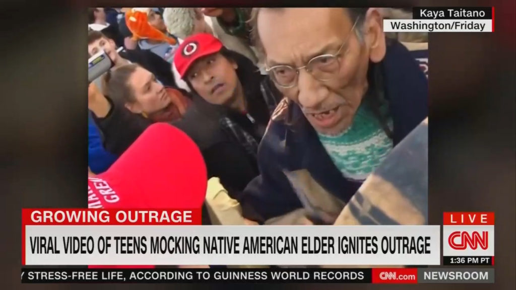 Sunday evening, Mark has published a piece at Patheos apologizing a bit – although his Facebook and Twitter posts calling these teenagers “MAGA goons” are still up. He has now embraced the narrative that Phillips was a peacemaker, so there’s that. (I repeat – look at this video and see if it would strike you, if you were there as “Oh, this fellow is trying to bring peace into this situation as he drums in my face and his grandson yells at my classmate.” He also says,