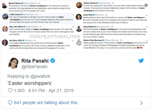 Seen on Facebook. “To sum up the media coverage (and Democrat response) to the Easter bombings in Sri Lanka: ‘Some people they won’t identify (Islamists) did something (killed them) to some other people they won’t identify (Christians) for reasons they can’t explain (Islamic terrorism).’ Got it?”