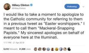 Funny, but with our current Pope, PopeWatch suspects that Hillary wishes that Catholics were more papist, her understanding of that term being the usual Protestant misunderstanding of “slavish devotion” to the Pope as characterizing faithful Catholics, whereas upholding Catholic orthodoxy is the true hallmark of faithful Catholics.
