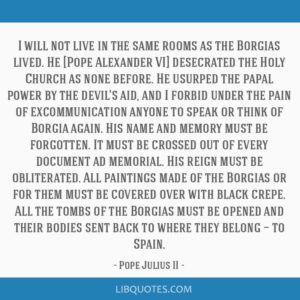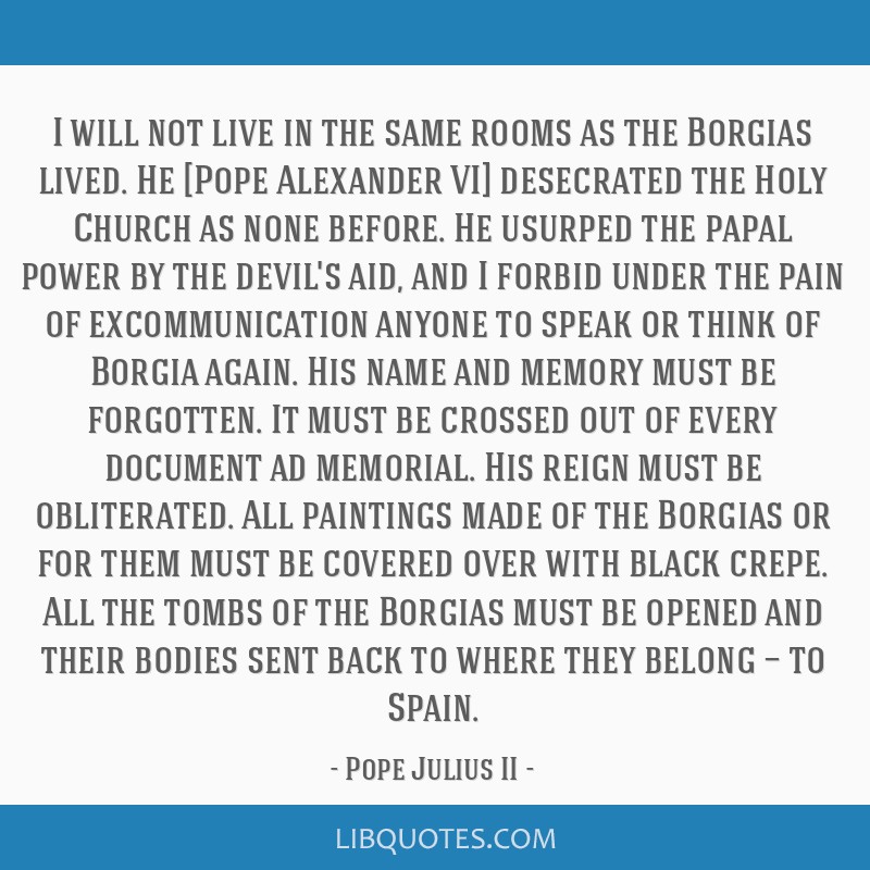 As with all fallen humans there was much to criticize about Pope Julius.  He had a daughter as a Cardinal, and often his temper was violent and abrupt.  However, there was also much in him to praise.  He began the process of raising up the Papacy from the sewer left by the Borgias, he preserved the independence of the Papal States and rescued future Popes from being mere chaplains to whichever monarchy was the most powerful, and with his calling of the Fifth Lateran Council he set in motion the process of reform that would culminate in the Council of Trent.  His faith in God was absolute and he was a steadfast guardian of the teachings of the Church.  Perhaps the dreadful Alexander VI was given by God to be the Pope that Catholics deserved, and then God, in His mercy, after the 26 day reign of Pius III, sent us Julius II as the Pope we needed.  May God in our time give us a similar completely unmerited act of His mercy.