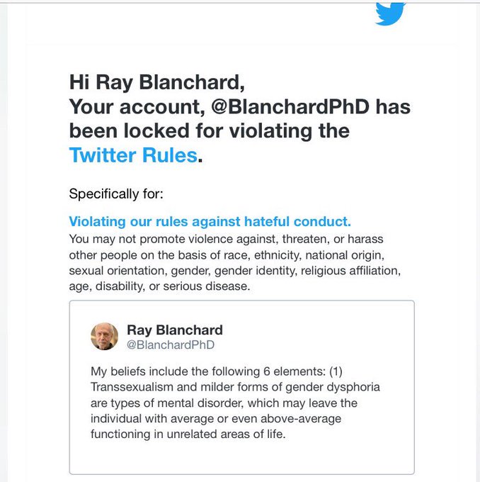 @ Donald – have no fear. Within a half hour of my posting on Dr. Blanchard’s Twitter page that while I disagree with his pro-LGBTQ agenda, I support his right to rationally and dispassionately voice his opinion in the public forum, I was placed in Twitter jail for hate speech. Not including this, a number of anti-LGBTQ posts I had made was cited. This is great. These effeminate, androgynous, cowardly, emasculated girly-boy techies in the State of Californication cannot abide free speech of at all. Anything that doesn’t confirm them in their godless sexual perversion is hate speech. Facebook, Twitter, Google, etc. – it’s all the same. Truthfully, I have no animosity against the gay guy or lesbian girl who keeps his or her sex life private – heck, I am a hetero and I want mine private too! Live and let live is what I say. But oppose the LGBTQ culture of sexual idolatry in the public forum and yes, you will be de-platformed. The only reason Dr. Blanchard is restored is because of his fame.