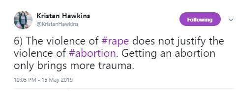 If the baby goes away, the fact that a woman was raped doesn’t. Do they not get this? So their solution is to compound the womans horrible circumstances, harming the woman further and tell her to abort the child. The faultless child. So the woman is left to deal with being a)raped and b) having an abortion- two acts of violence.
