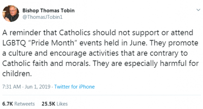 I have praised Bishop Thomas J. Tobin of the Diocese of Providence before in posts at The American Catholic, but not today. On June 1, he tweeted this: