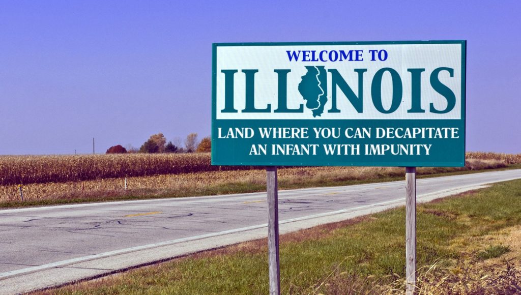 The signs used to display the traditional state slogan, “Land of Lincoln.” But since the state is now on the cusp of allowing abortions all the way up until and through the moment of birth, including the barbaric practice of infant decapitation, state officials said the new slogan is much more fitting.