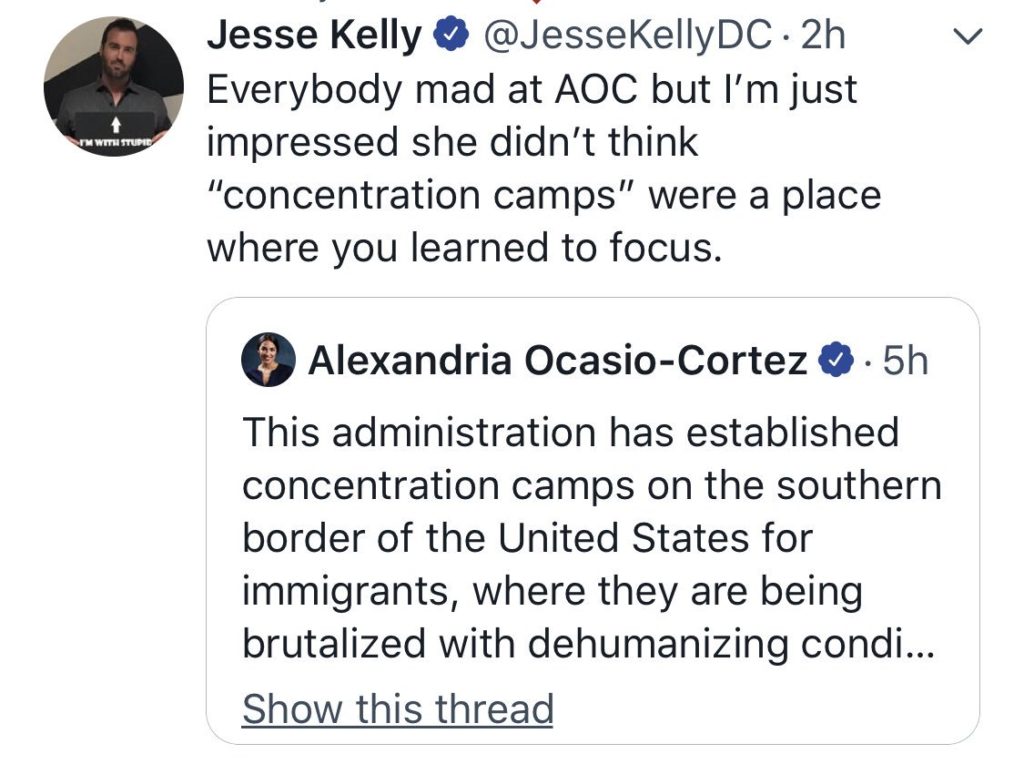 Congresswoman Ocasio-Cortez: a crazy member of Congress for crazy times. At the Dachau concentration camp some 188000 human beings were murdered before its liberation by American troops. For her to use this memory of horror to try to get political mileage demonstrates her lack of intelligence, morality and the lack of intelligence and morality she assumes to exist in the general American public.