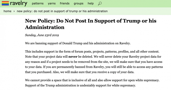 One YouTuber announcing her withdrawal from Ravelry cited a non-political reason. She is a knitting pattern designer, and is very concerned that Ravelry is doing nothing to crack down on pattern piracy (the unethical collecting of what are supposed to be paid patterns in various Yahoo groups and then posting those patterns as free patterns on Ravelry). She feels (and I agree) that it would be a much wiser use of Ravelry’s resources to crack down on pattern piracy than to enact a policy banning content supportive of a politician the Ravelry admins do not like.