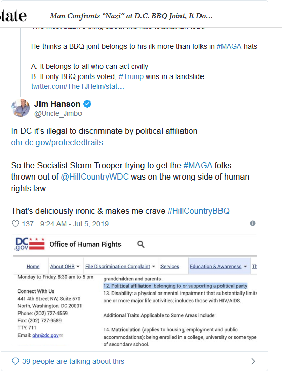 Guy wears MAGA hat at my favorite restaurant. I say “hey are you from dc?” He says “no.” I say “we don’t tolerate racism in this city.” His girlfriend then physically jabs fingers into my chest and starts threatening me. Management tells me to leave, not woman who assaulted me.
