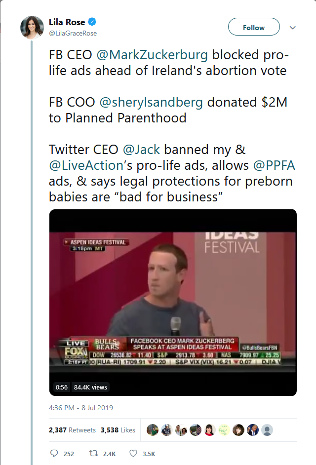 There needs to be a class action lawsuit against Facebook, Twitter, Google to prohibit them from any form of censorship or at least define their rules for censoring. Example: One of the mainstays of their business is porn which is harmful to everyone. How can allow porn and not a pro-life ad? Something is seriously wrong.