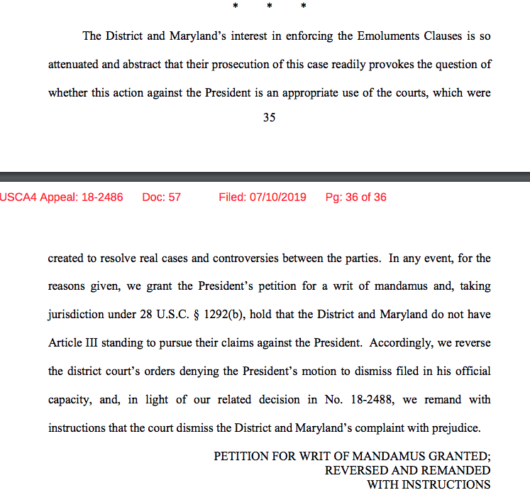 The never ending attempt of those who oppose President Trump to get rid of him by hook or crook took a punch in the face when a panel of the United States Court of Appeals for the Fourth Circuit dismissed with prejudice the emoluments clause lawsuits brought by Maryland and the District of Columbia, ruling these entities had no standing to bring such a suit. Go here to read the decision.
