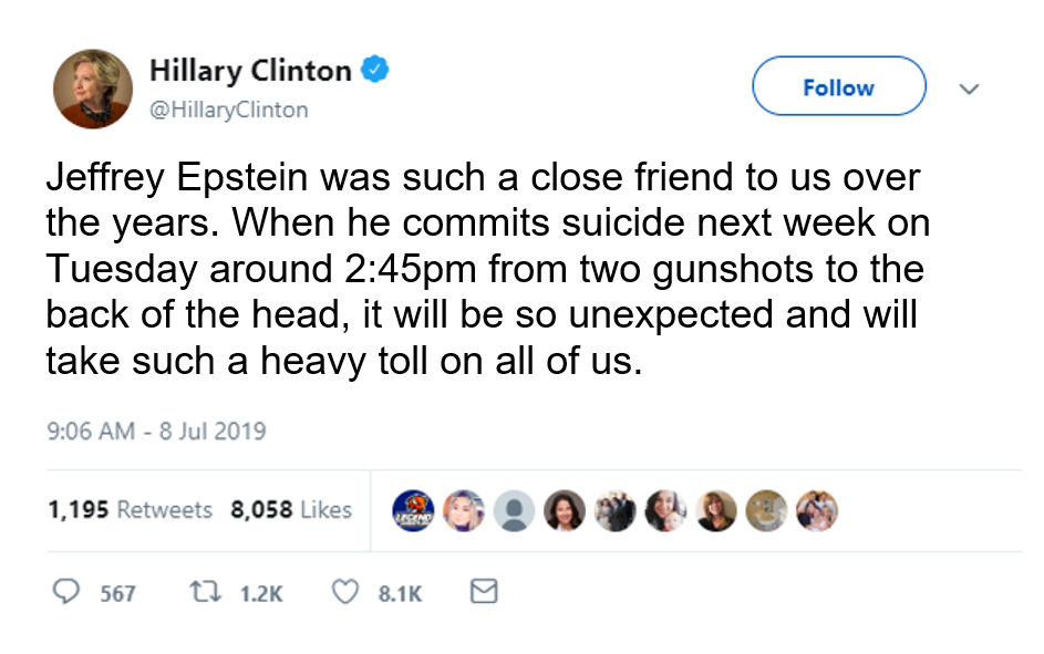 Let me ask a question. If Epstein was on suicide watch, how did he get the stuff to commit suicide? Did someone throw a rope into the cell with a note, “Love, Hilary?”