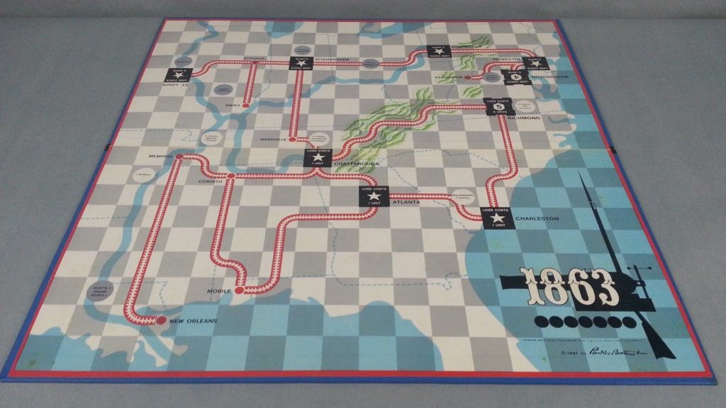While I was at GenCon this year I purchased for a buck a Parker Brothers game published in 1961 called 1863. The game was a very primitive strategic wargame, no doubt published in an attempt to cash in on the Civil War Centennial. I hadn’t realized this but Parker Brothers had a long history of publishing games on American Wars, as Susan Asbury noted in a post in 2017: