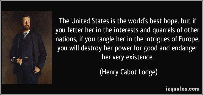 National I must remain, and in that way I like all other Americans can render the amplest service to the world. The United States is the world’s best hope, but if you fetter her in the interests and quarrels of other nations, if you tangle her in the intrigues of Europe, you will destroy her power for good and endanger her very existence. Leave her to march freely through the centuries to come as in the years that have gone.