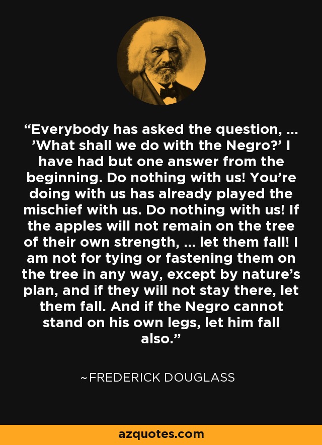 In regard to the colored people, there is always more that is benevolent, I perceive, than just, manifested towards us. What I ask for the negro is not benevolence, not pity, not sympathy, but simply justice. The American people have always been anxious to know what they shall do with us… I have had but one answer from the beginning. Do nothing with us! Your doing with us has already played the mischief with us. Do nothing with us! If the apples will not remain on the tree of their own strength, if they are worm-eaten at the core, if they are early ripe and disposed to fall, let them fall! … And if the negro cannot stand on his own legs, let him fall also. All I ask is, give him a chance to stand on his own legs! Let him alone! If you see him on his way to school, let him alone, don’t disturb him! If you see him going to the dinner table at a hotel, let him go! If you see him going to the ballot box, let him alone, don’t disturb him! If you see him going into a work-shop, just let him alone, — your interference is doing him positive injury.