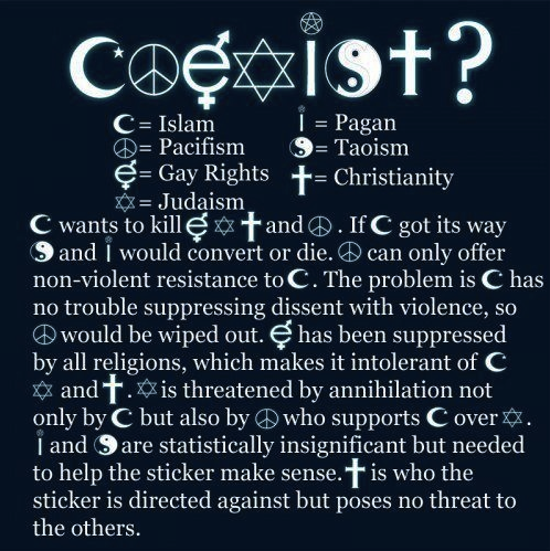 Go here to read the rest. My bride likes to put doodads on our cars, most non-political. The only thing I can think of myself putting on one of our cars was a flag decal immediately after 9-11 in 2001. I have always doubted the wisdom of sharing political beliefs in traffic. There is enough road rage already, and to spare. As for the Co-Exist bumper sticker, my favorite take on it: