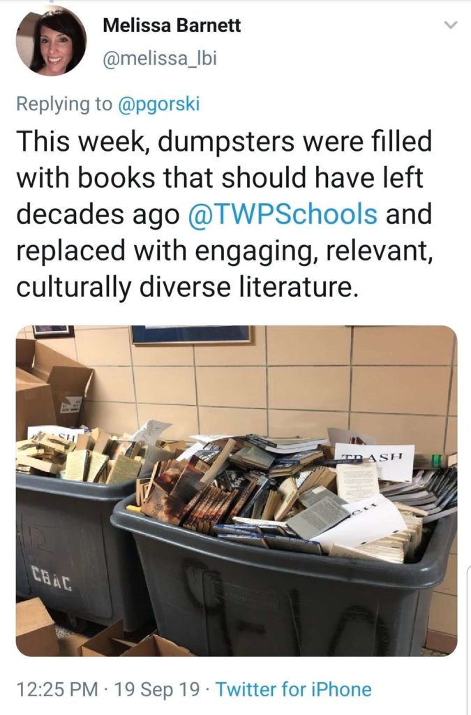 Not sure what books are being discarded in the picture above. If it’s some of the crappy-hippy-dippy kid-and-teen “with it” stuff of the past couple of decades, good riddance. That’s pulp that should been left in the tree.