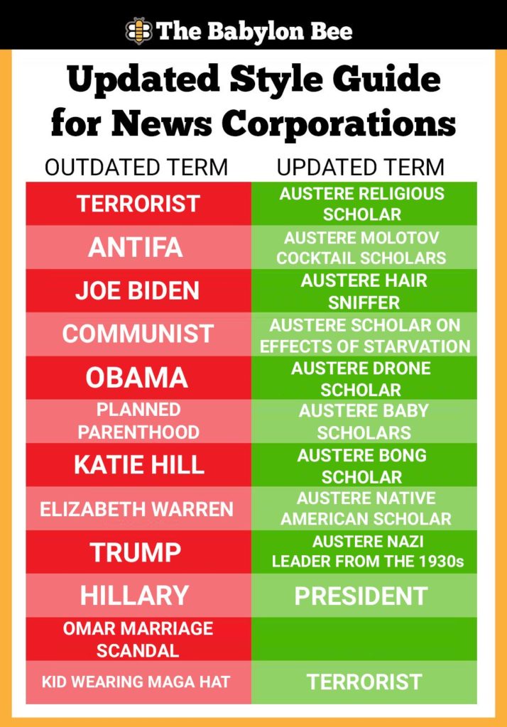 News that I missed, courtesy of The Babylon Bee.  The Bee, always eager to help the dullards of the Fourth Estate, has published the above style guide.  Go here to read about it.