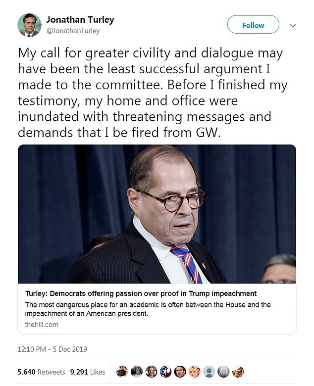 During my 37 years at the bar I have seen quite a few cases lost due to a poor choice in experts.  Rule one about experts is that they should act like experts: knowledgeable, dispassionate and objective.  If they seem like  hired guns in court, which they are of course, their utility fades away faster than a crooked used car salesman’s smile after the keys are handed over.  Having constitutional experts attempting to justify impeachment was a foolish move in any case.  Congress is the sole decider on impeachment, with the American people waiting in the wings in the next election if they get it wrong.  At best such testimony is a waste of time.  At worst it is a disaster which is what happened to the Democrats this week.  The only expert who acted like an expert was Jonathan Turley, a non-supporter of Trump who does not believe a case warranting impeachment has been made.