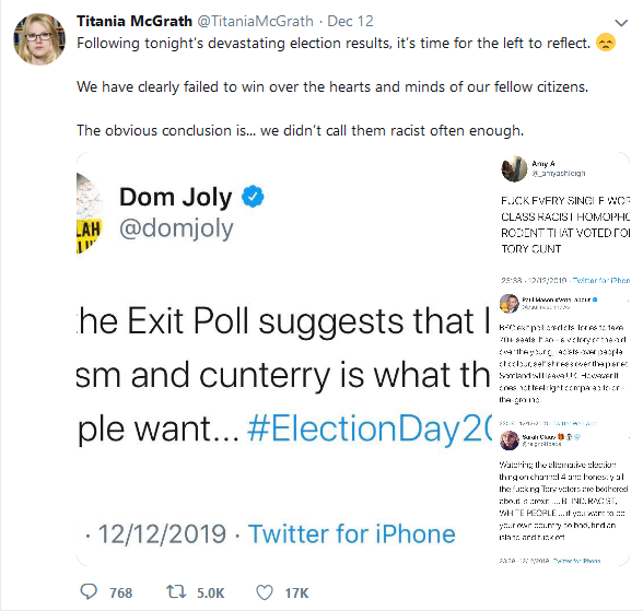 Plenty of better writers than me—Douglas Murray, John Gray—have debunked the notion that the only reason low-income voters embrace right-wing politics is because they’re drunk on a cocktail of ethno-nationalism and false hope (with Rupert Murdoch and Vladimir Putin taking turns as mixologists). It surely has more to do with the Left’s sneering contempt for the “deplorables” in the flyover states as they shuttle back and forth between their walled, cosmopolitan strongholds. As Corbyn’s policy platform in Britain’s election showed, left-wing parties now have little to offer indigenous, working class people outside the big cities—and their activists often add insult to injury by describing these left-behind voters as “privileged” because they’re white or cis-gendered or whatever. So long as parties like Labour pander to their middle-class, identitarian activists and ignore the interests of the genuinely disadvantaged, they’ll continue to rack up loss after loss. Get woke, go broke.