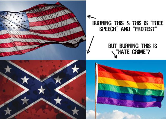 Go here to read the rest. So let’s unpack this shall we? The US Supreme Court has ruled that laws punishing the burning of the American flag are unconstitutional because of their infringement on freedom of speech. Now we have a man getting 16 years for the petty theft of stealing a gay flag and burning it later. (Treating such a burning as arson is truly absurd.) As Orwell observed in Animal Farm, some animals are more equal than others.
