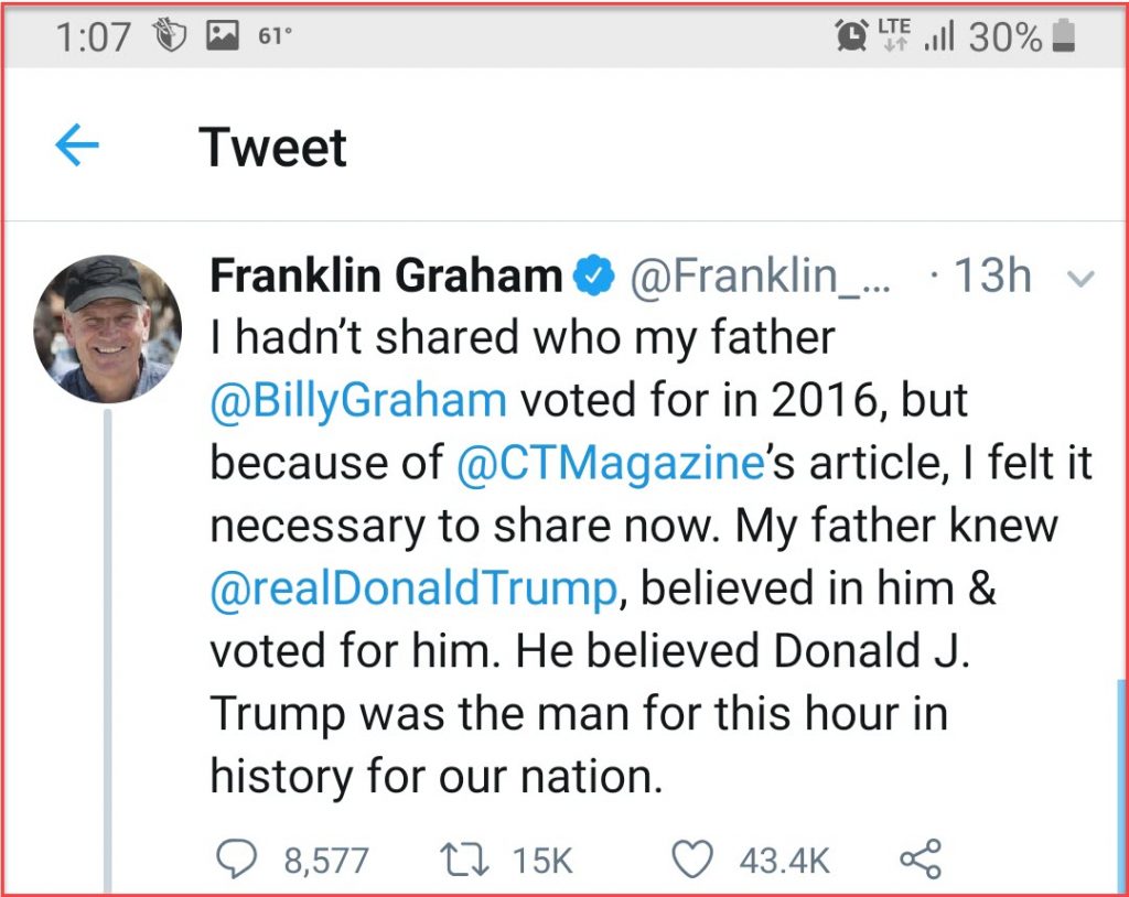 Christianity Today would do well to learn from these Biblical examples, and from the fact that regardless of his tweets and foul mouth, Donald Trump (unlike every single godlessly wicked Democrat) is pro-life. No other issue is of greater importance than a baby’s innocent life which every single Democratic candidate for President would snuff out even up to the moment of birth. Hate Donald Trump’s tweets and mouth all you want; he protects the lives of innocent babies.