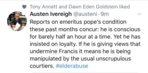 Go here to read the rest.  Pope Benedict is to blame for resigning, the Conclave of 2013 is to blame for choosing Pope Francis and Pope Francis is to blame for being one of the worst popes in the history of the Church.  What an unholy mess.  The Francis sycophants are reacting just the  way one would expect.