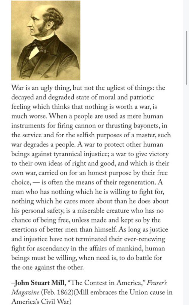 I’m impressed with John Stuart Mills in this writing. Mostly he is remembered for the lifeboat ethics which has been debunked when 7 men survived 4 days at sea in a lifeboat built for 4. When I asked about sacrifice in philosophy 101, I was told to shut up and sit down. Here Mills speaks about the sacrifice required of patriots