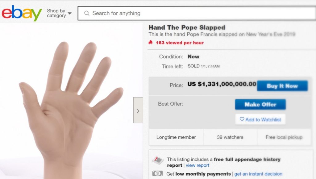 ROME—New Year’s Eve the world witnessed a historical event when the Pope repeatedly slapped a woman’s hand after she tugged on his arm in a forceful, Trump-like fashion. While the Pope went on to issue an apology for the incident, the woman, Susan Née, had the hand wrapped in cellophane and immediately removed. She then put the severed appendage on eBay where an intense bidding war hit an incredible price of $1.3 billion before closing.