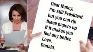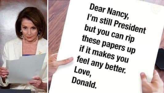 In politics it is usually not hard to see which side has the advantage. The other side is usually reduced to acts of impotent rage. Nancy Pelosi’s childish ripping up of Trump’s speech was a symbol of defeat. Thank you Nancy for not having the courage to stand up to your left wing in the House. Thank you for allowing the futile Impeachment which has given the President a superb launching pad for his re-election campaign. And, thank you, most of all, for being the perfect cartoon villian foil for Trump.