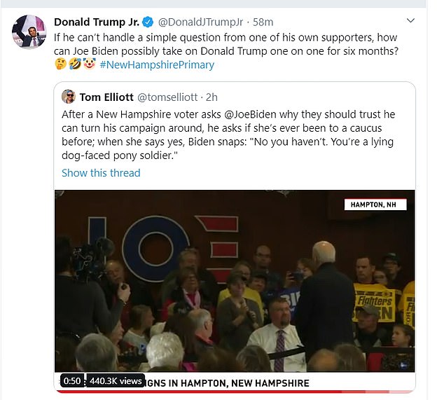 Calling a voter, even in jest, a lying dog-faced pony soldier, is more than odd.  Biden needs an intervention stat from friends and family to get him out of the campaign.  Visions of Trump beating him up in the fall would be akin to using a machine gun to slay sleeping elderly ducks floating on the top of a pool.  With targets painted on their backsides.