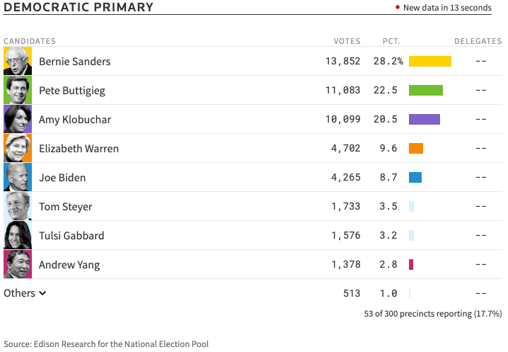 Later results give narrower gap between bernie & pete. I wish folks would disabuse themselves of the notion that buttigeig (sp?) is a “moderate.” the only moderate thing about him is his speech. He is anti-life to the nth degree. Same with klobuchar. Pardon me, I’m a single issue voter.