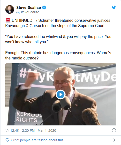 Unhinged, yeah. Schumer threatened Gorsuch and Kavanaugh by name. He wasn’t talking about the House and Senate Republicans as his spokesman maintained. The comments were so egregious that the Chief Justice has admonished Schumer. Also the American Bar Association has rebuked the Senator. Will Schumer apologize?