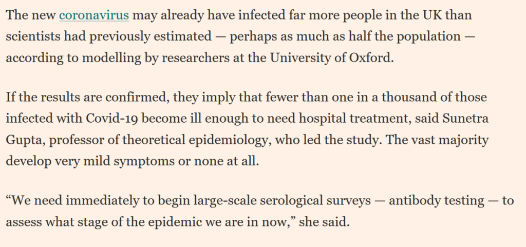 Now here comes a study at the University of Oxford that poses a mind-boggling question: What if half of the British population is already infected with coronavirus? What if the percentage of infected people who need hospitalization for COVID-19 is actually teeny tiny because, unbeknownst to us, the overall infected population is actually enormously large? If half of Great Britain is already infected, the country is already well on its way to acquiring herd immunity, which means they may be seeing the worst of the epidemic right now. There’s no true “mass casualty” scenario as the virus spreads. It’s already spread. And it turns out it’s harmless in virtually everyone who gets it.