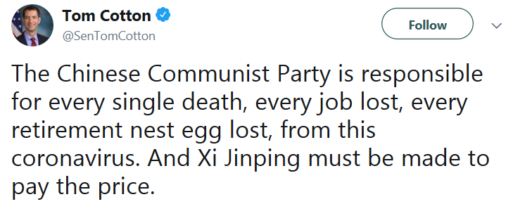Remember that, way back on February 16 on Fox News, Senator Tom Cotton first shone a bright light on the Wujan National Virology Institute as the potential source of this virus —And was severely criticized by the “main stream” pro-China hyena-media-pack as a “conspiracy theorist” and a far-right loon—as was Maria Bartiromo and Fox News.