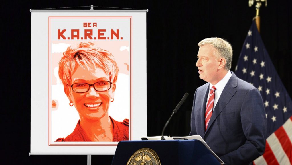“It is up to every citizen to watch and monitor everyone else and report to the police anything they don’t like,” de Blasio said. “That’s why we have created a new enforcement program: Knowledgeable Actors Reporting Edict Noncompliance, or KAREN for short.”