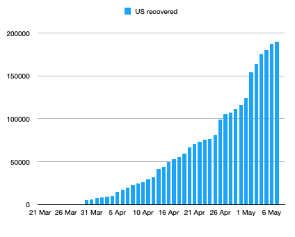 Note that there is a weekly periodicity to both graphs but a steady increase in both. In particular, the ratio of recovered to deaths is increasing from about 1.5 to a little less than 3. (That statistic for S. Korea is about 36 and has varied for European countries from less than 1—UK—to over 10—Germany.) As stated above, the absolute values of the numbers are likely to be low, possibly by an order of magnitude or more, given the likely large number of unreported covid-19 infections.