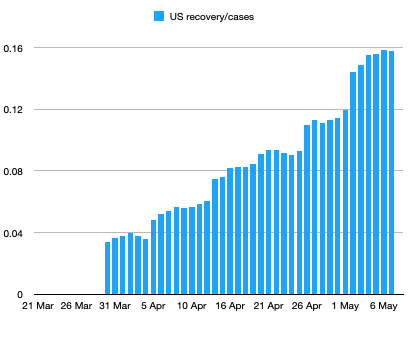 Do the numbers show any signs that things are getting better? One statistic that is most likely to reflect reality is the recovery rate. There should be no ambiguity in defining recovery from being sick with covid-19, so there’s no likely way the numbers could be inflated (or deflated). The number is of course, underestimated since asymptomatic cases or cases with mild symptoms haven’t been reported. But it’s certainly ok to show trends and as a baseline. Here are two graphs showing the progression of recovered cases and the ratio, recovered/cases.