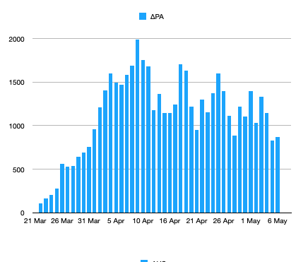 Here’s one more encouraging sign. The daily case numbers for Pennsylvania (as given by the Pennsylvania Department of Health) are showing a steady decrease,