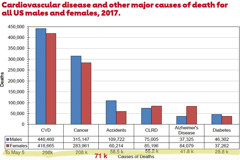 Here’s the game: I’ve taken mortality figures from a 2020 report by the American Heart Association for the year 2017. The numbers for various causes of death are given in the featured image and repeated here; to normalize these number to give deaths up to May 5th, I’ve simply multiplied by 125/365 (the number of days to May 5/ number of days in the year). The numbers are shown in the image below, rounded off to the nearest 1000. The death toll in the US attributed to covid-19 is 71 k, as of May 5 (again, rounded off to the nearest 1000).