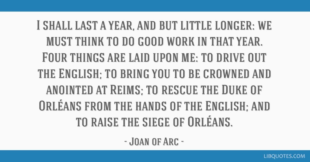 An American Historian when asked who was the greatest of the Founding Father’s replied, Joan of Arc of course. If Joan had not won the Battle of Orleans, there’d have been to King of France to support our revolution