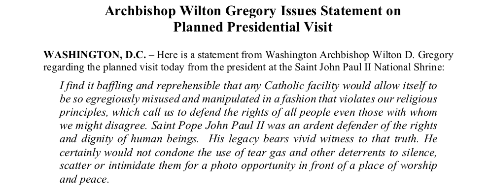 I was astonished at these remarks by Archbishop Gregory. It was unfortunate enough that he castigated our President. But his attack on the St. John Paul II Shrine itself runs the risk of making it a target. My wife and I have been blessed to visit this wonderful shrine a number of times. I hope and pray that it will not now be a target of violence due to the Archbishops words.