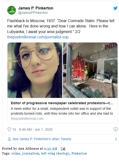 Honey, consider yourself lucky. Some of the rioters would doubtless rape and /or murder you if they had half a chance. That is what violent mobs do. I would hope that she learns something from this, but the Left seems to be the home these days of invincible ignorance.