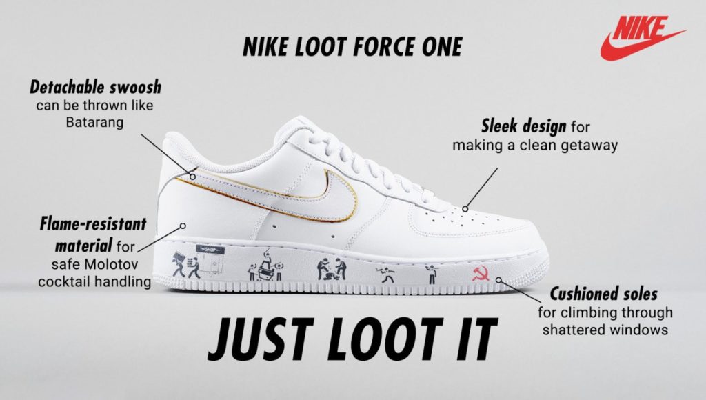 “We stand in solidarity with those looting stores and getting free stuff to show how much they care about justice,” said a Nike representative. “To that end, we are releasing this $250 pair of shoes some Chinese lady made for 30 cents.”