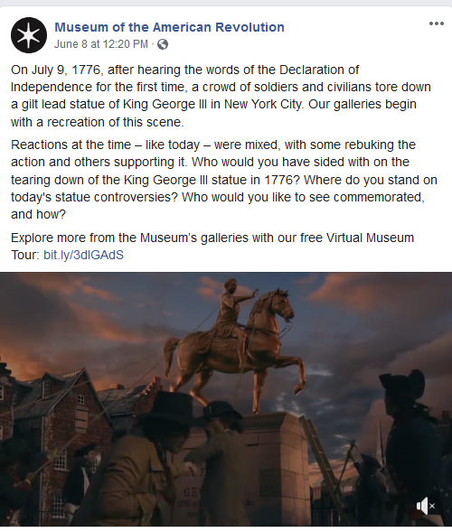 In the case of the linked story, the confrontation goes something like this: “You say you’re against removing statues, but look at this. The patriots in New York City tore down a statue of King George III after hearing a reading of the Declaration of Independence! So you disagree with that? Of course it was ‘liberals’ back then who wanted to remove the statue and ‘conservatives’ who wanted to remain loyal to the King and leave it up; just like today it’s ‘liberals’ who want to remove statues of the ‘enemy’ and ‘conservatives’ who want to keep them.”