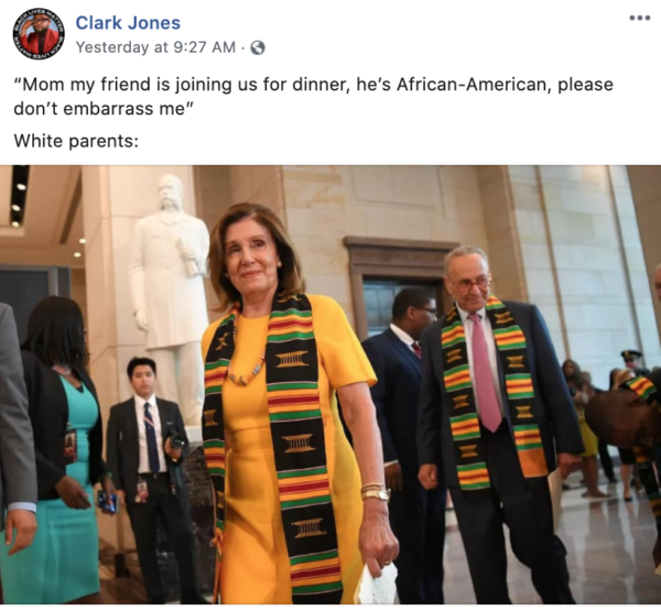 Evidently Pelosi, Schumer, et al., are being berated by Black Twitter users. Turns out that their Stoles of Wokeness are made of kente cloth, which is particular to the Ashantis of Ghana— a tribe notorious for getting rich selling less fortunate Africans to white slave traders…